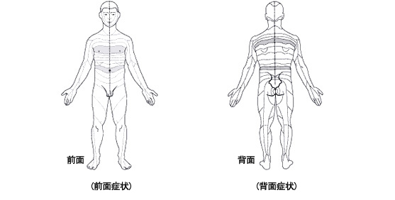 赤外線サーモグラフィ診断所見 : posterior and upper backにmultiple hot spotがみえてillregular heat sprite and flareが激しく、Rt L/EはL5-S1皮節に体温低下がある。